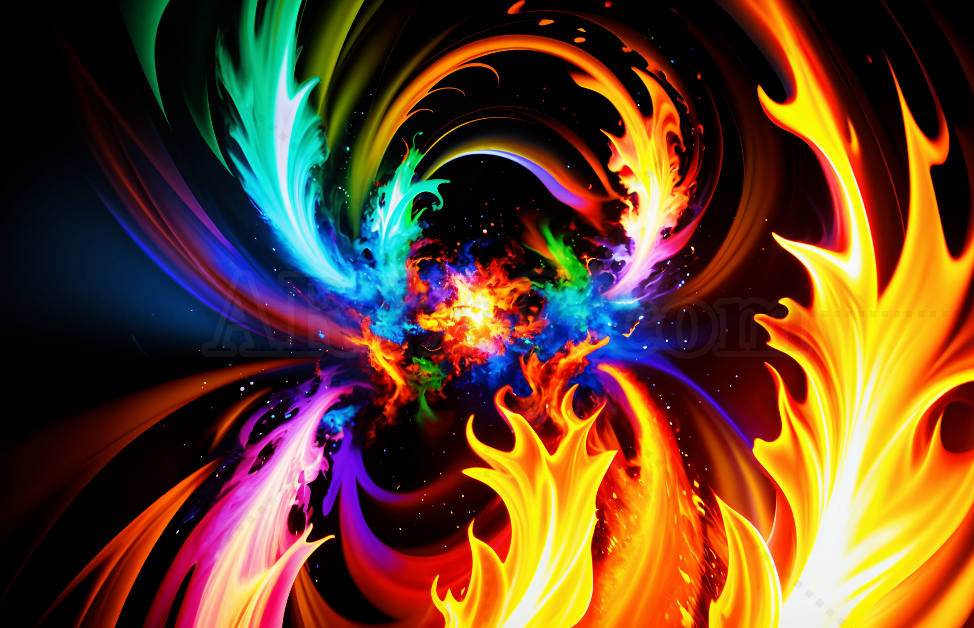This stock image presents a visually stunning abstract portrayal of fire swirls in a vibrant explosion of colors. The interplay of intense blues, reds, oranges, and purples creates a dynamic and energetic scene, perfect for use in creative projects, digital backgrounds, or as compelling visual content for multimedia presentations.